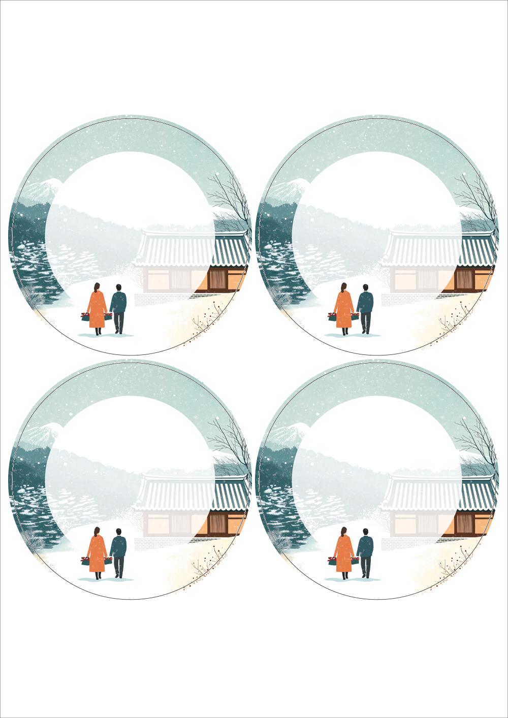 디자인된 A4 라벨지 출력용 라벨스티커, 규격코드: 504, 디자인코드: DA1579(설레는 귀향, 눈내리는 설날), Φ98 (mm) 원형