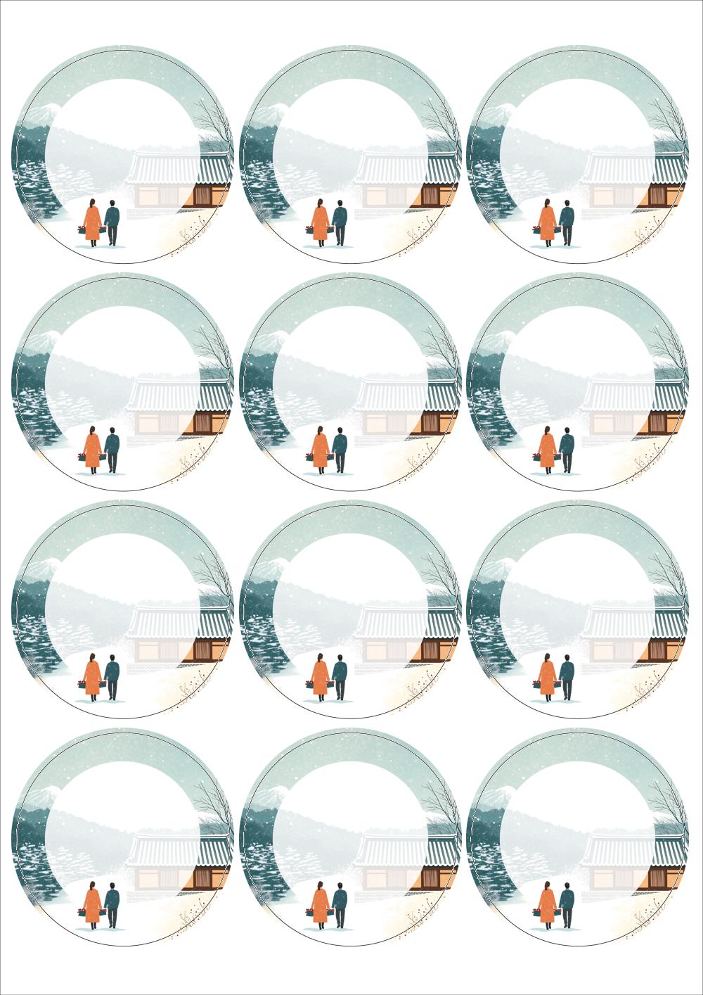 디자인된 A4 라벨지 출력용 라벨스티커, 규격코드: 534, 디자인코드: DA1579(설레는 귀향, 눈내리는 설날), Φ63.7 (mm) 원형