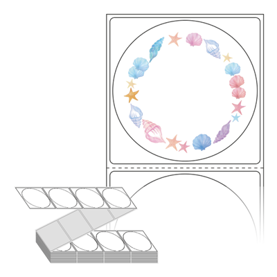 텍스트, 이미지, 도형, 바코드 등을 쉽게 출력 할 수 있으며 엑셀파일 등의 연동도 가능합니다. 라벨 모양대로 이미 칼선이 있기 때문에 출력 후 바로 떼어서 사용 하시면 됩니다.
